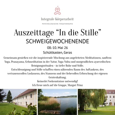 Gemeinsam genießen wir die inspirierende Mischung aus angeleiteten Sitzmeditationen, sanftem Yoga, Pranayama, Gehmeditation in der Natur, Yoga Nidra und morgendlichen ayurvedischen Reinigungsritualen - in tiefer Ruhe und Stille.